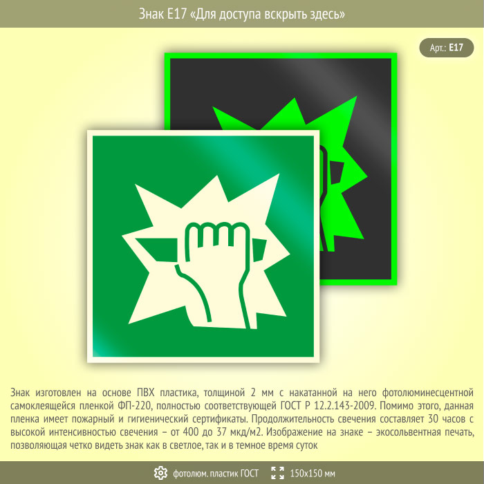 Знак E17 «Для доступа вскрыть здесь» (фотолюминесцентный пластик ГОСТ 34428-2018, 150х150 мм) в Верее купить