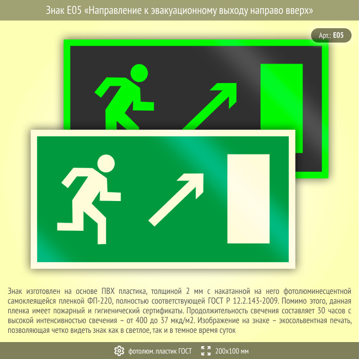 Знак E05 «Направление к эвакуационному выходу направо вверх» (фотолюминесцентный пластик ГОСТ 34428-2018, 200х100 мм) в Верее купить