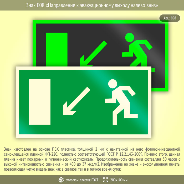 Знак E08 «Направление к эвакуационному выходу налево вниз» (фотолюминесцентный пластик ГОСТ 34428-2018, 200х100 мм) в Верее купить