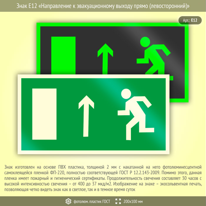 Знак E12 «Направление к эвакуационному выходу прямо (левосторонний)» (фотолюминесцентный пластик ГОСТ 34428-2018, 200х100 мм) в Верее купить