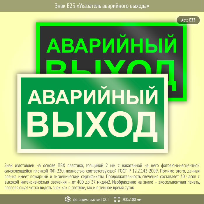 Знак E23 «Указатель аварийного выхода» (фотолюминесцентный пластик ГОСТ 34428-2018, 200х100 мм) в Верее купить