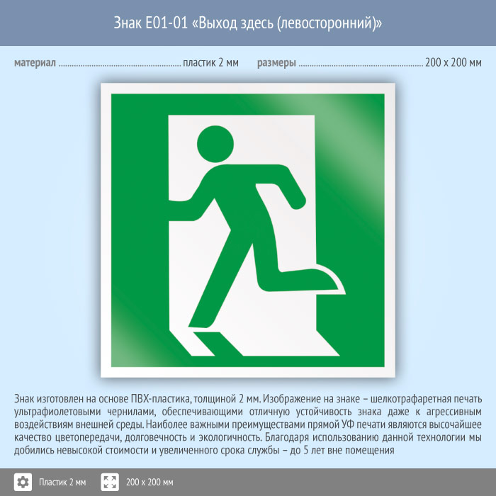 Знак E01-01 «Выход здесь (левосторонний)» (пластик, 200х200 мм) в Верее купить