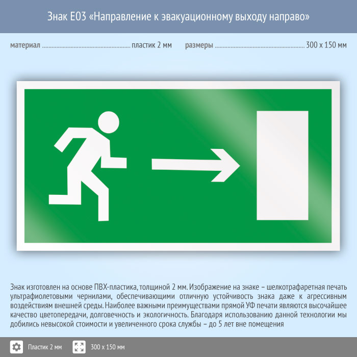 Знак E03 «Направление к эвакуационному выходу направо» (пластик, 300х150 мм) в Верее купить