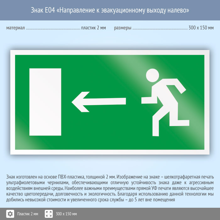 Знак E04 «Направление к эвакуационному выходу налево» (пластик, 300х150 мм) в Верее купить