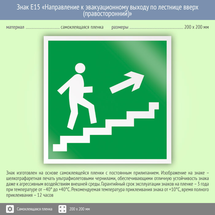 Знак E15 «Направление к эвакуационному выходу по лестнице вверх (правосторонний)» (пленка, 200х200 мм) в Верее купить