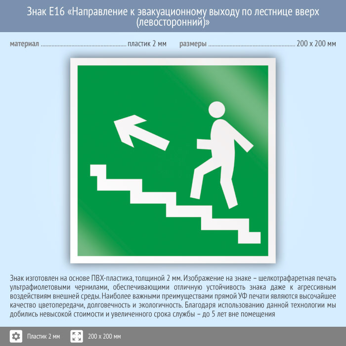 Знак E16 «Направление к эвакуационному выходу по лестнице вверх (левосторонний)» (пластик, 200х200 мм) в Верее купить
