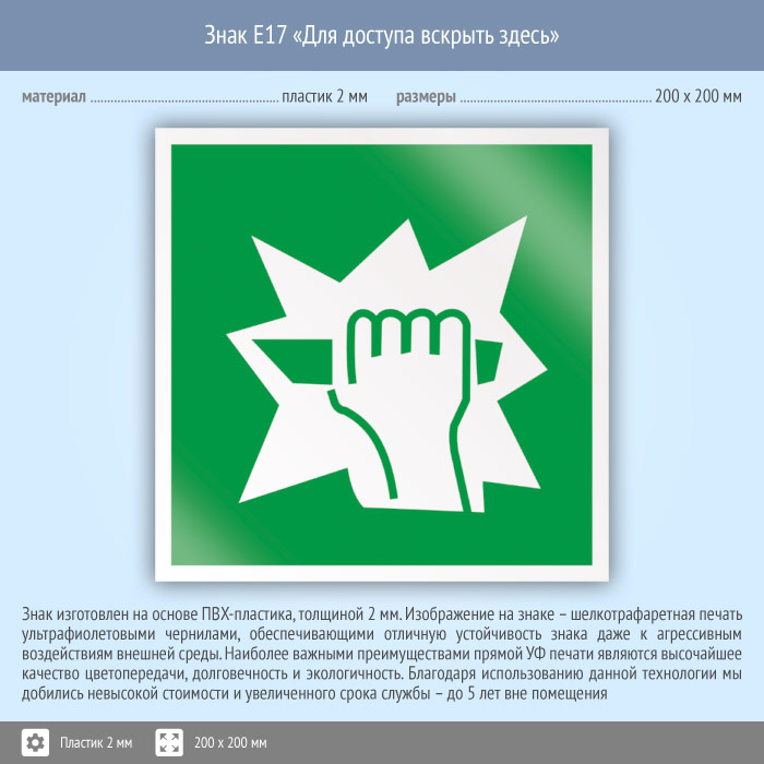Знак E17 «Для доступа вскрыть здесь» (пластик, 200х200 мм) в Верее купить