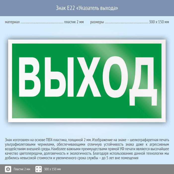 Знак E22 «Указатель выхода» (пластик, 300х150 мм) в Верее купить