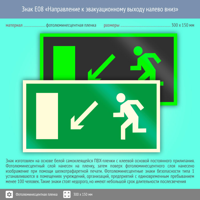 Знак E08 «Направление к эвакуационному выходу налево вниз» (фотолюминесцентная пленка, 300х150 мм) в Верее купить