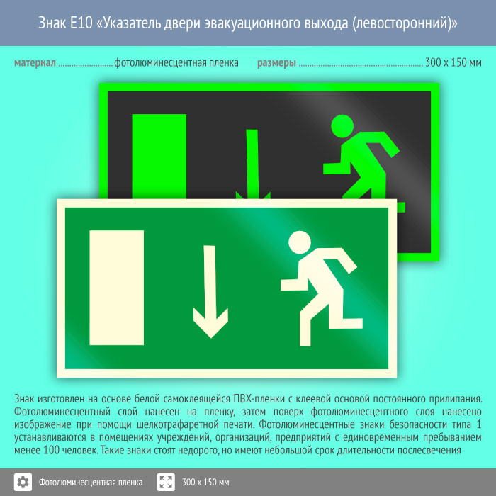 Знак E10 «Указатель двери эвакуационного выхода (левосторонний)» (фотолюминесцентная пленка, 300х150 мм) в Верее купить