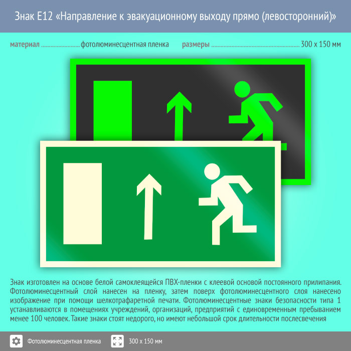 Знак E12 «Направление к эвакуационному выходу прямо (левосторонний)» (фотолюминесцентная пленка, 300х150 мм) в Верее купить