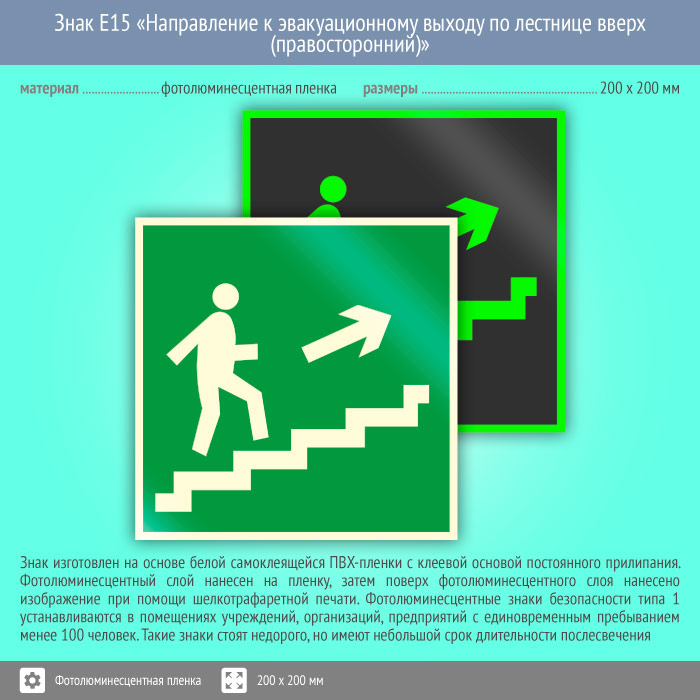 Знак E15 «Направление к эвакуационному выходу по лестнице вверх (правосторонний)» (фотолюминесцентная пленка, 200х200 мм) в Верее купить
