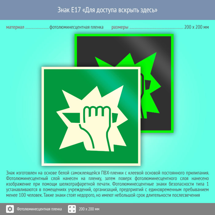 Знак E17 «Для доступа вскрыть здесь» (фотолюминесцентная пленка, 200х200 мм) в Верее купить