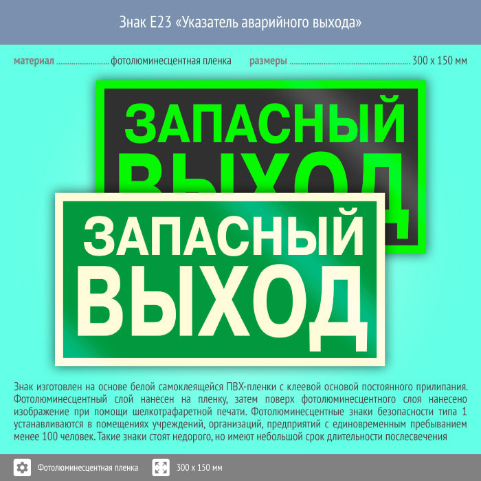 Знак E23 «Указатель запасного выхода» (устаревший) (фотолюминесцентная пленка, 300х150 мм) в Верее купить