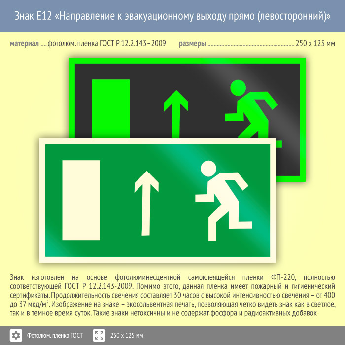 Знак E12 «Направление к эвакуационному выходу прямо (левосторонний)» (фотолюминесцентная пленка ГОСТ 34428-2018, 250х125 мм) в Верее купить