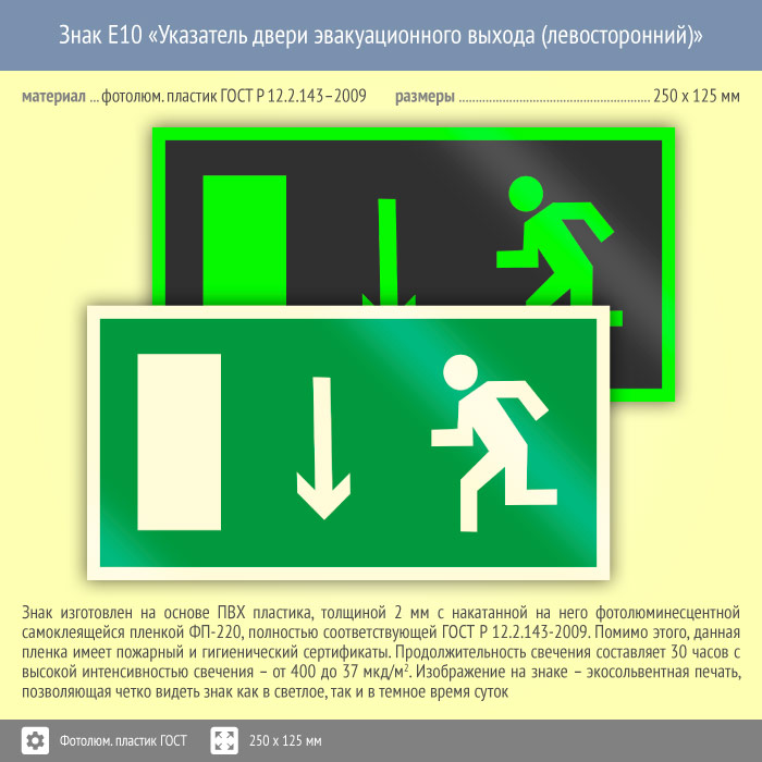 Знак E10 «Указатель двери эвакуационного выхода (левосторонний)» (фотолюминесцентный пластик ГОСТ 34428-2018, 250х125 мм) в Верее купить