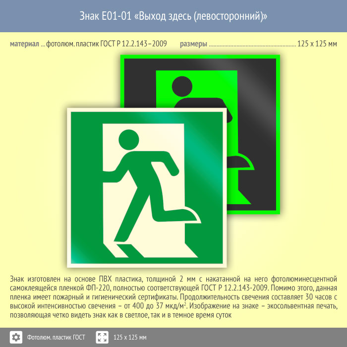 Знак E01-01 «Выход здесь (левосторонний)» (фотолюминесцентный пластик ГОСТ 34428-2018, 125х125 мм) в Верее купить