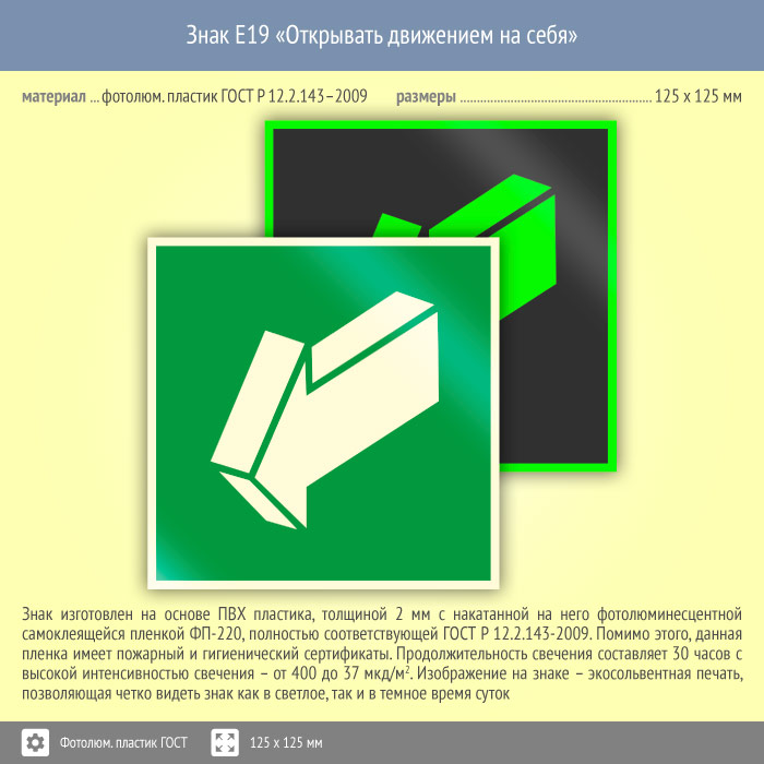 Знак E19 «Открывать движением на себя» (фотолюминесцентный пластик ГОСТ 34428-2018, 125х125 мм) в Верее купить