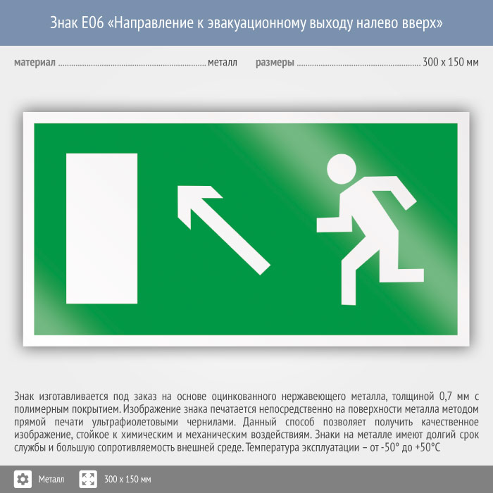 Знак E06 «Направление к эвакуационному выходу налево вверх» (металл, 300х150 мм) в Верее купить