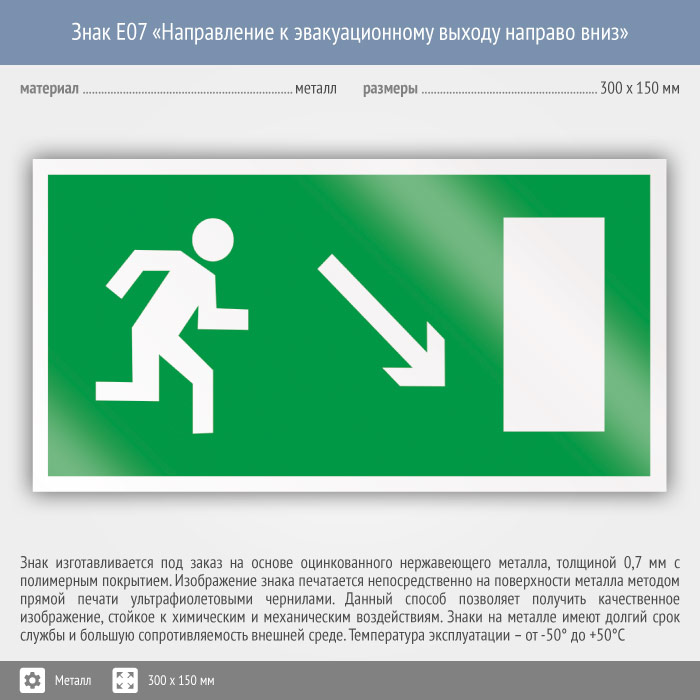 Знак E07 «Направление к эвакуационному выходу направо вниз» (металл, 300х150 мм) в Верее купить