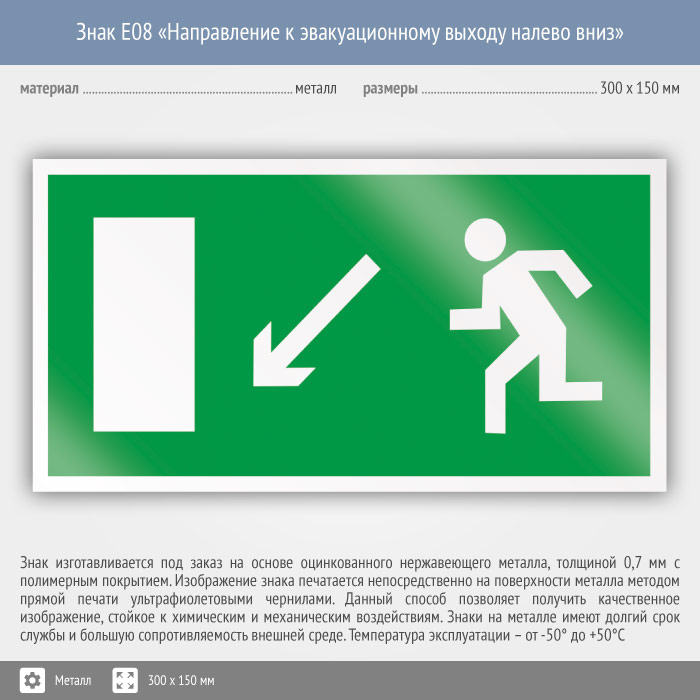 Знак E08 «Направление к эвакуационному выходу налево вниз» (металл, 300х150 мм) в Верее купить
