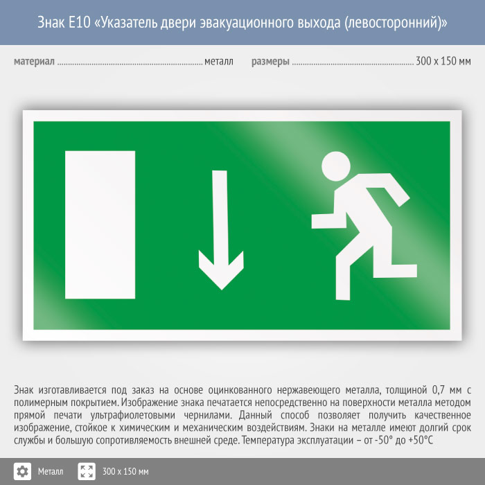 Знак E10 «Указатель двери эвакуационного выхода (левосторонний)» (металл, 300х150 мм) в Верее купить