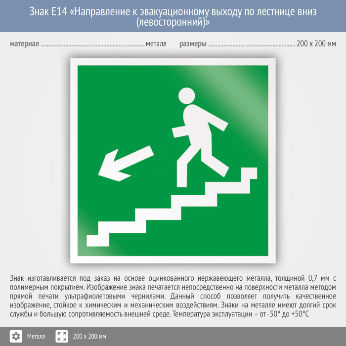 Знак E14 «Направление к эвакуационному выходу по лестнице вниз (левосторонний)» (металл, 200х200 мм) в Верее купить