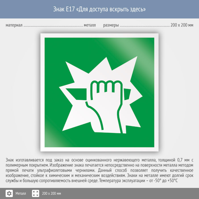 Знак E17 «Для доступа вскрыть здесь» (металл, 200х200 мм) в Верее купить