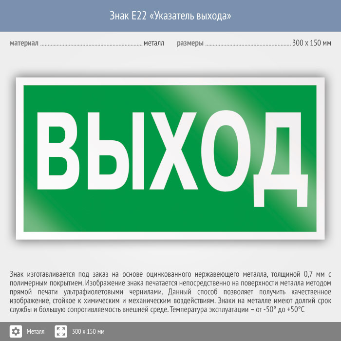 Знак E22 «Указатель выхода» (металл, 300х150 мм) в Верее купить