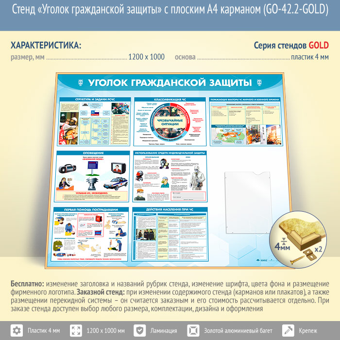 Стенд «Уголок гражданской защиты» с плоским А4 карманом (GO-42.2-GOLD) в Верее купить