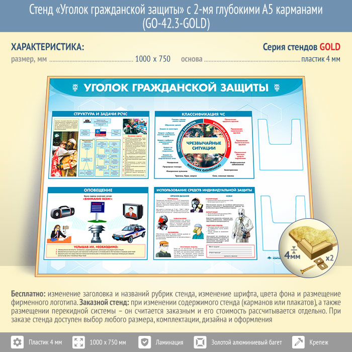 Стенд «Уголок гражданской защиты» с 2-мя глубокими А5 карманами (GO-42.3-GOLD) в Верее купить