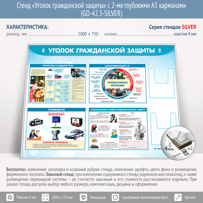 Стенд «Уголок гражданской защиты» с 2-мя глубокими А5 карманами (GO-42.3-SILVER) в Верее купить