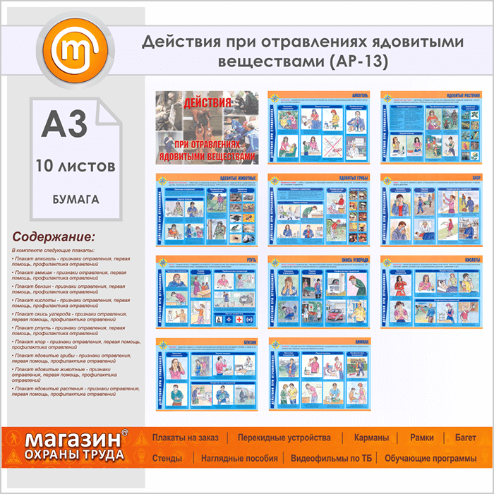 Плакаты «Действия при отравлениях ядовитыми веществами» (АР-13, бумага, А3, 10 листов) в Верее купить