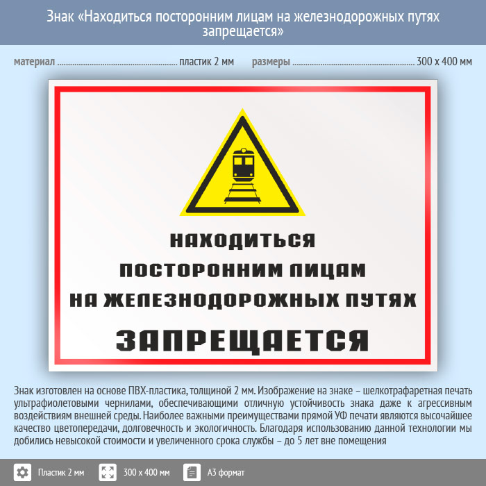 Знак «Находиться посторонним лицам на железнодорожных путях запрещается», КЗ-24 (пластик, 400х300 мм) в Верее купить
