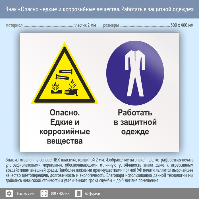 Знак «Опасно - едкие и коррозийные вещества. Работать в защитной одежде», КЗ-35 (пластик, 400х300 мм) в Верее купить
