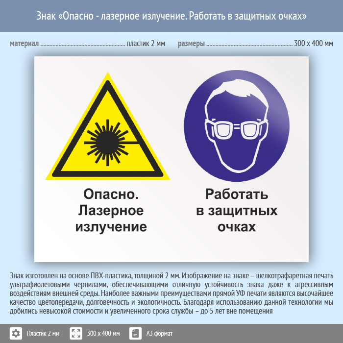 Знак «Опасно - лазерное излучение. Работать в защитных очках», КЗ-38 (пластик, 400х300 мм) в Верее купить