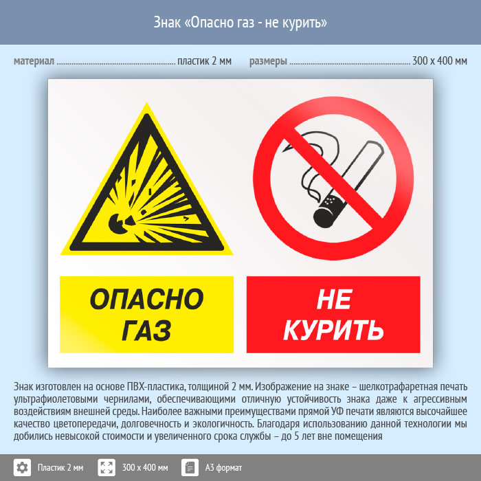 Знак «Опасно газ - не курить», КЗ-44 (пластик, 400х300 мм) в Верее купить