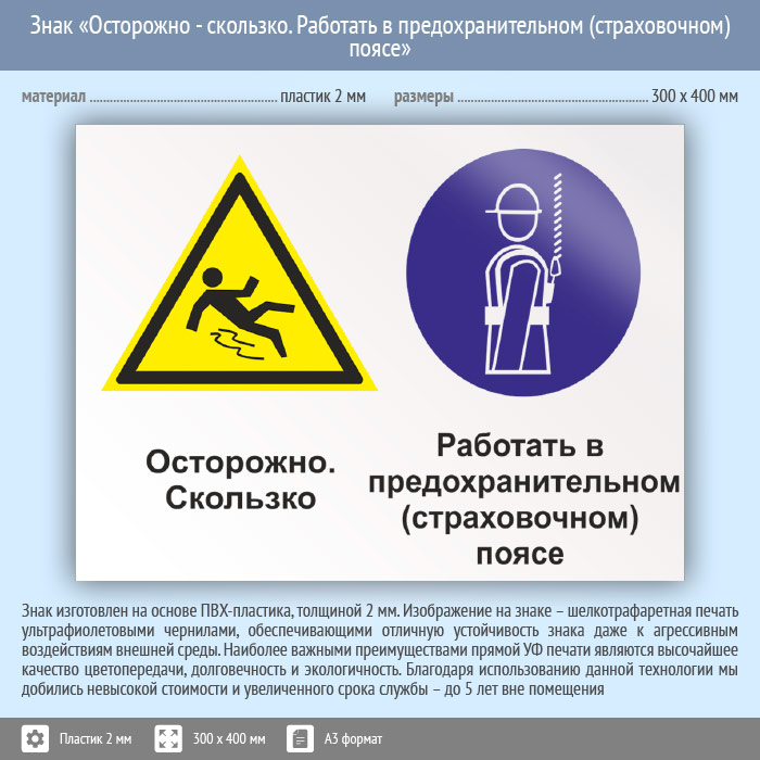 Знак «Осторожно - скользко. Работать в предохранительном (страховочном) поясе», КЗ-58 (пластик, 400х300 мм) в Верее купить