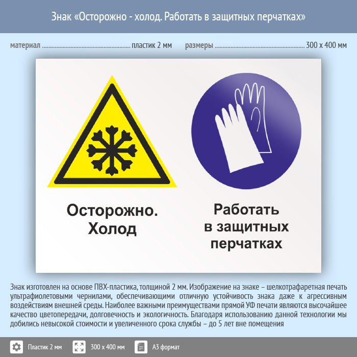 Знак «Осторожно - холод. Работать в защитных перчатках», КЗ-59 (пластик, 400х300 мм) в Верее купить