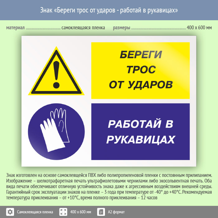 Знак «Береги трос от ударов - работай в рукавицах», КЗ-03 (пленка, 600х400 мм) в Верее купить