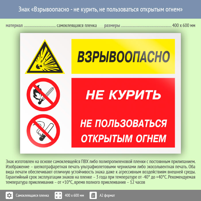 Знак «Взрывоопасно - не курить, не пользоваться открытым огнем», КЗ-05 (пленка, 600х400 мм) в Верее купить
