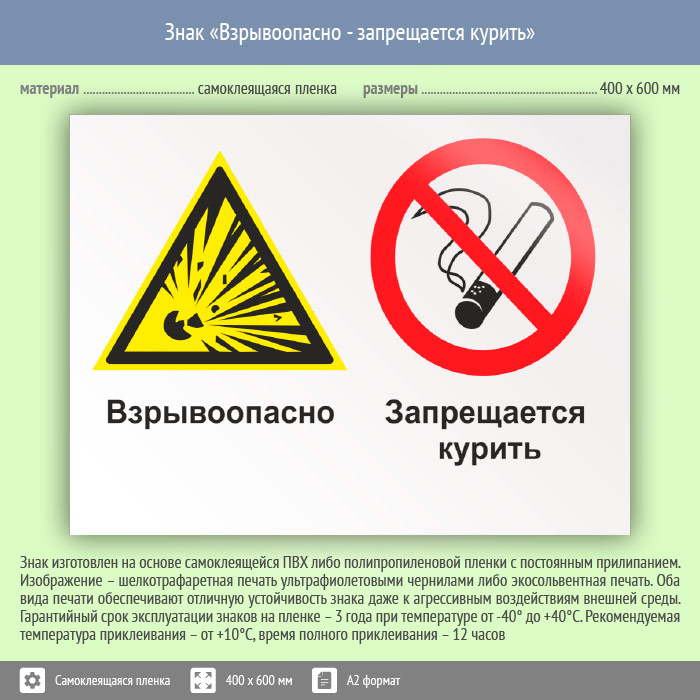 Знак «Взрывоопасно - запрещается курить», КЗ-06 (пленка, 600х400 мм) в Верее купить