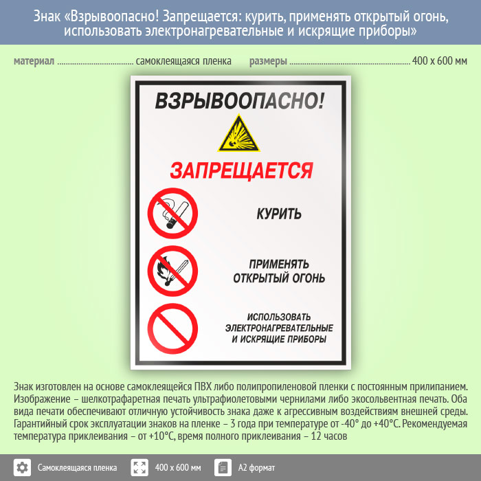 Знак «Взрывоопасно! Запрещается: курить, применять открытый огонь, использовать электронагревательные и искрящие приборы», КЗ-10 (пленка, 400х600 мм) в Верее купить