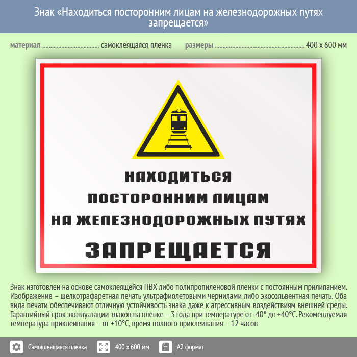 Знак «Находиться посторонним лицам на железнодорожных путях запрещается», КЗ-24 (пленка, 600х400 мм) в Верее купить