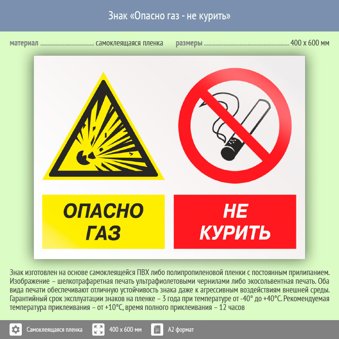 Знак «Опасно газ - не курить», КЗ-44 (пленка, 600х400 мм) в Верее купить