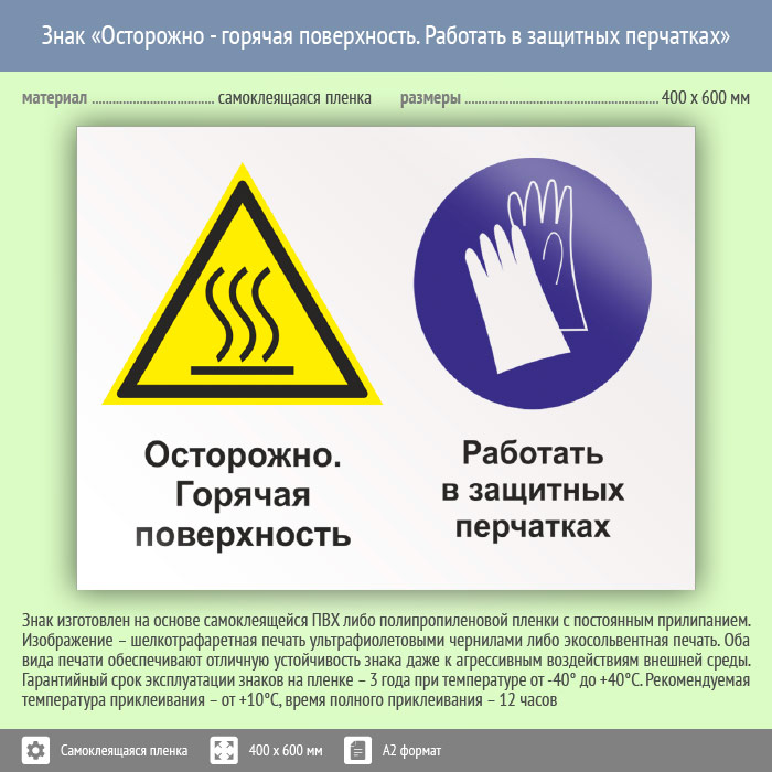 Знак «Осторожно - горячая поверхность. Работать в защитных перчатках», КЗ-55 (пленка, 600х400 мм) в Верее купить