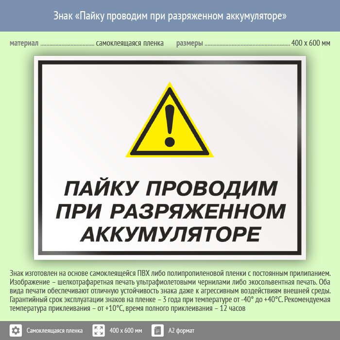 Знак «Пайку проводим при разряженном аккумуляторе», КЗ-62 (пленка, 600х400 мм) в Верее купить