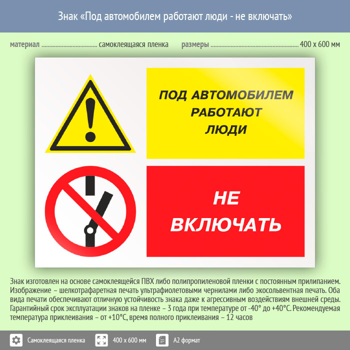 Знак «Под автомобилем работают люди - не включать», КЗ-65 (пленка, 600х400 мм) в Верее купить