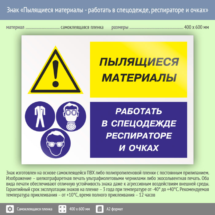 Знак «Пылящиеся материалы - работать в спецодежде, респираторе и очках», КЗ-79 (пленка, 600х400 мм) в Верее купить