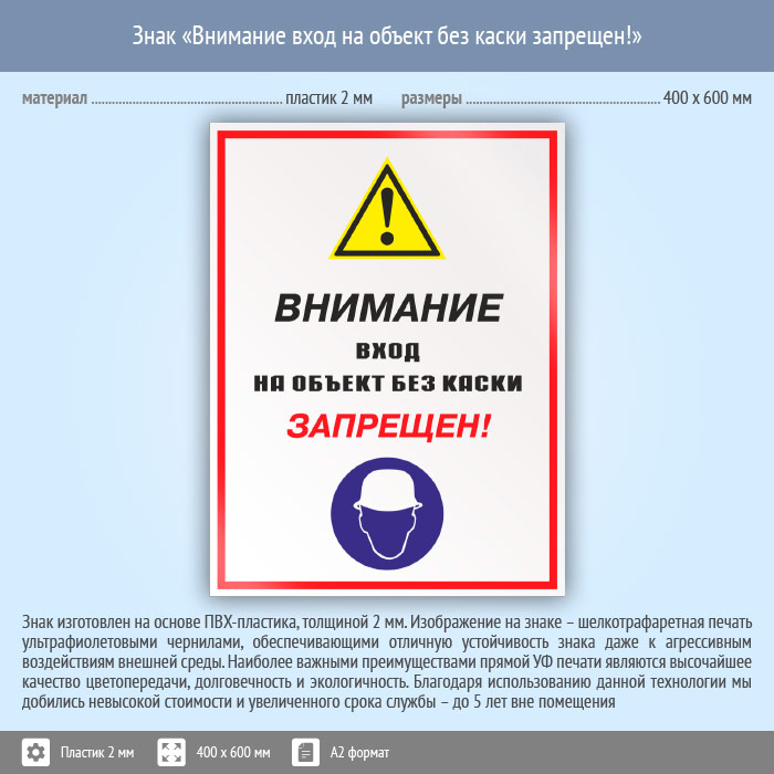 Знак «Внимание вход на объект без каски запрещен!», КЗ-13 (пластик, 400х600 мм) в Верее купить